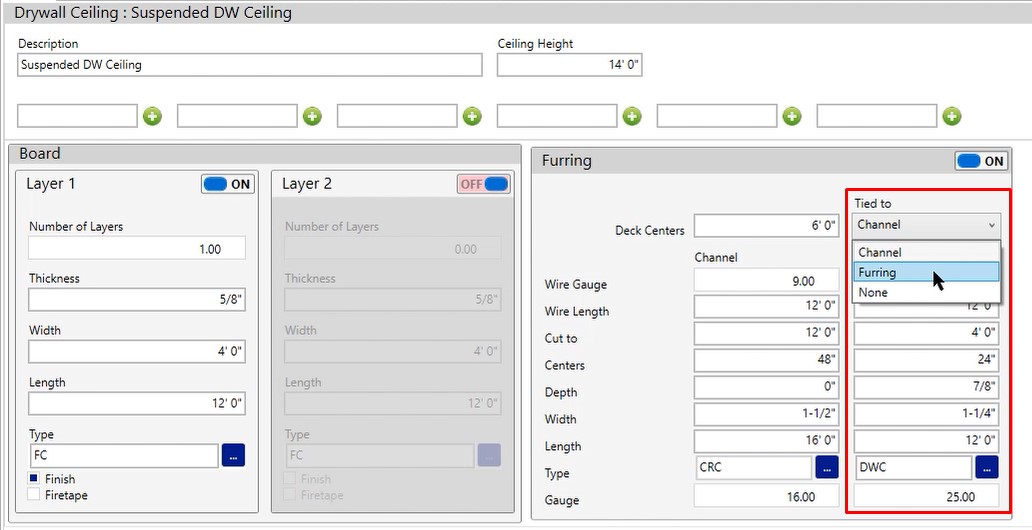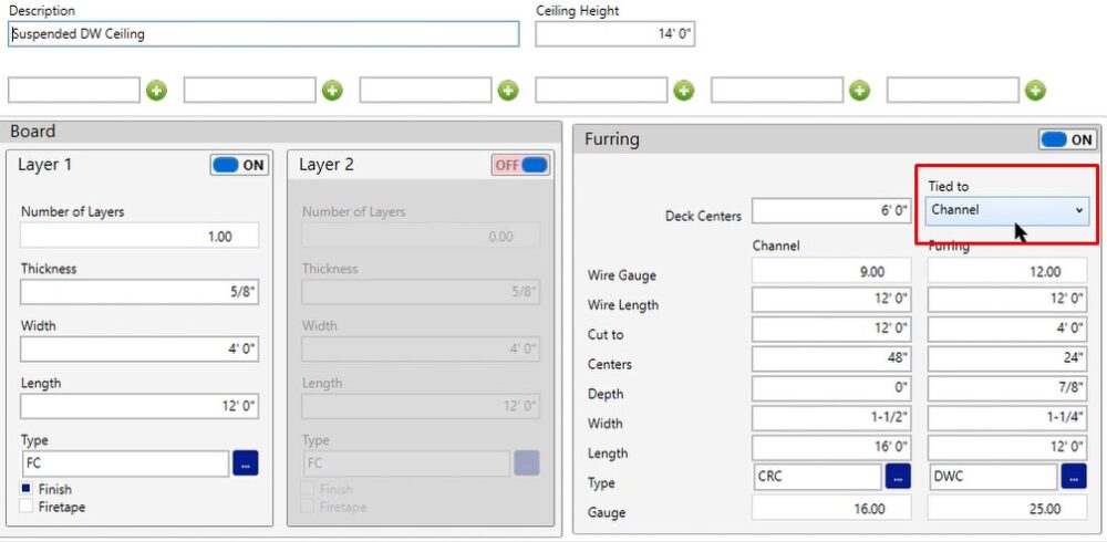 • Tied to – You have channel or furring to choose from and whatever you choose here depends on which column you’re going to be filling out the information and which column we’re going to be pulling data from for you.