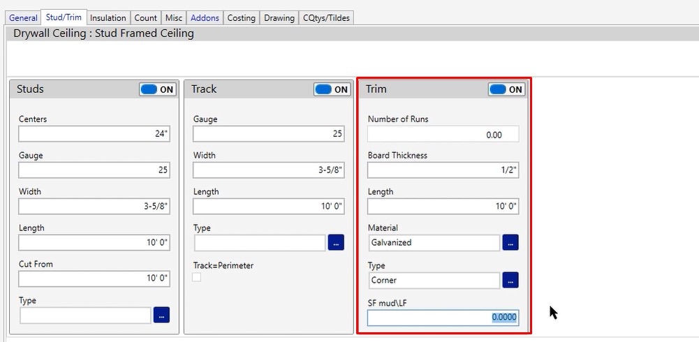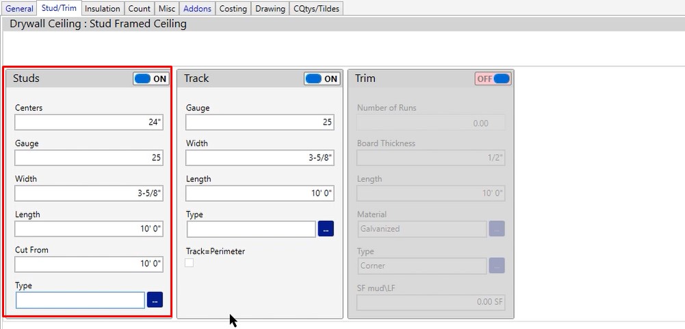 DW Ceiling Condition Properties – General, Stud & Trim Tabs