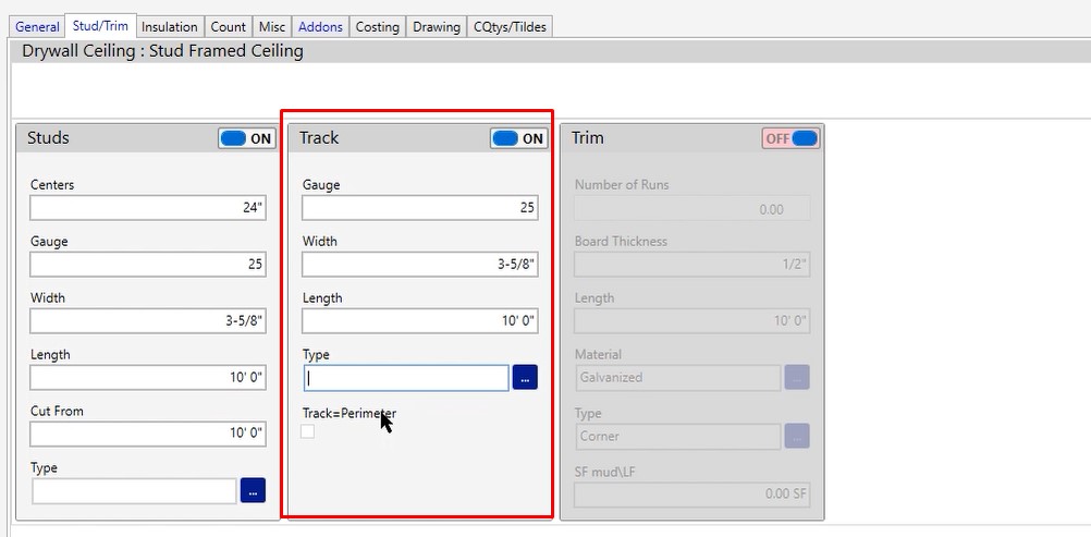 • Track=Perimeter –  If you want to have track equal the perimeter of your take off, click this checkbox and it will automatically calculate track around the perimeter of the area.