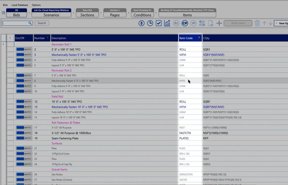 If you go to your condition level, you’ll be able to see the item code that’s assigned. For example, if we go into this roofing drawing, you’ll notice that at the item level, when we’re looking at the mechanically attached condition, you’ll see all of the item codes displayed.