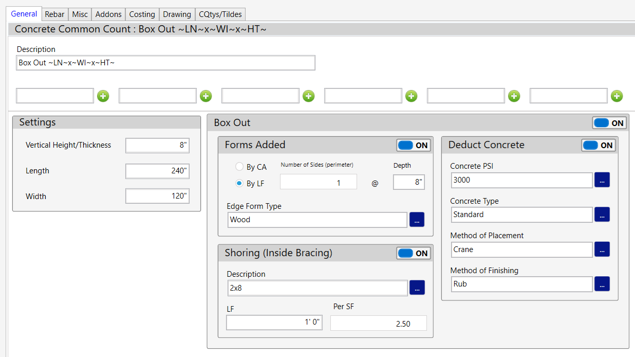 - Auto calculation – When a field is a result of other fields, it is often non-editable. Examples of this are the Lap Length for rebar or the CY Per LF for Excavation in a Wall Footing.