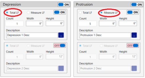 To do this, while on the drawing screen, the program will default to the primary measure mode. As an example, let’s say you measured a wall 20’ long. You want a depression in the wall to go the entire wall length. However, you want a protrusion to go only part of the wall length. You would set the Depression to “Total LF,” but the Protrusion to “Measure LF.” If you only had one depression and one protrusion, the setup would look like this: